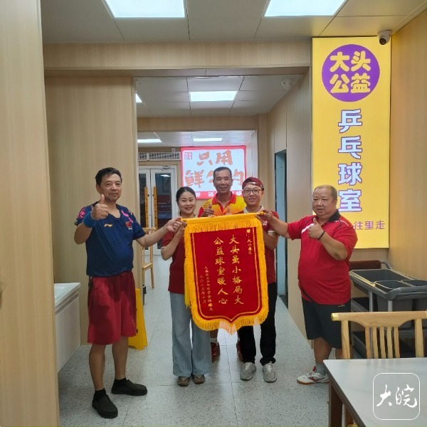 7月8日上午,球友赵先生、丁先生等人为大头公益乒乓室送来锦旗。